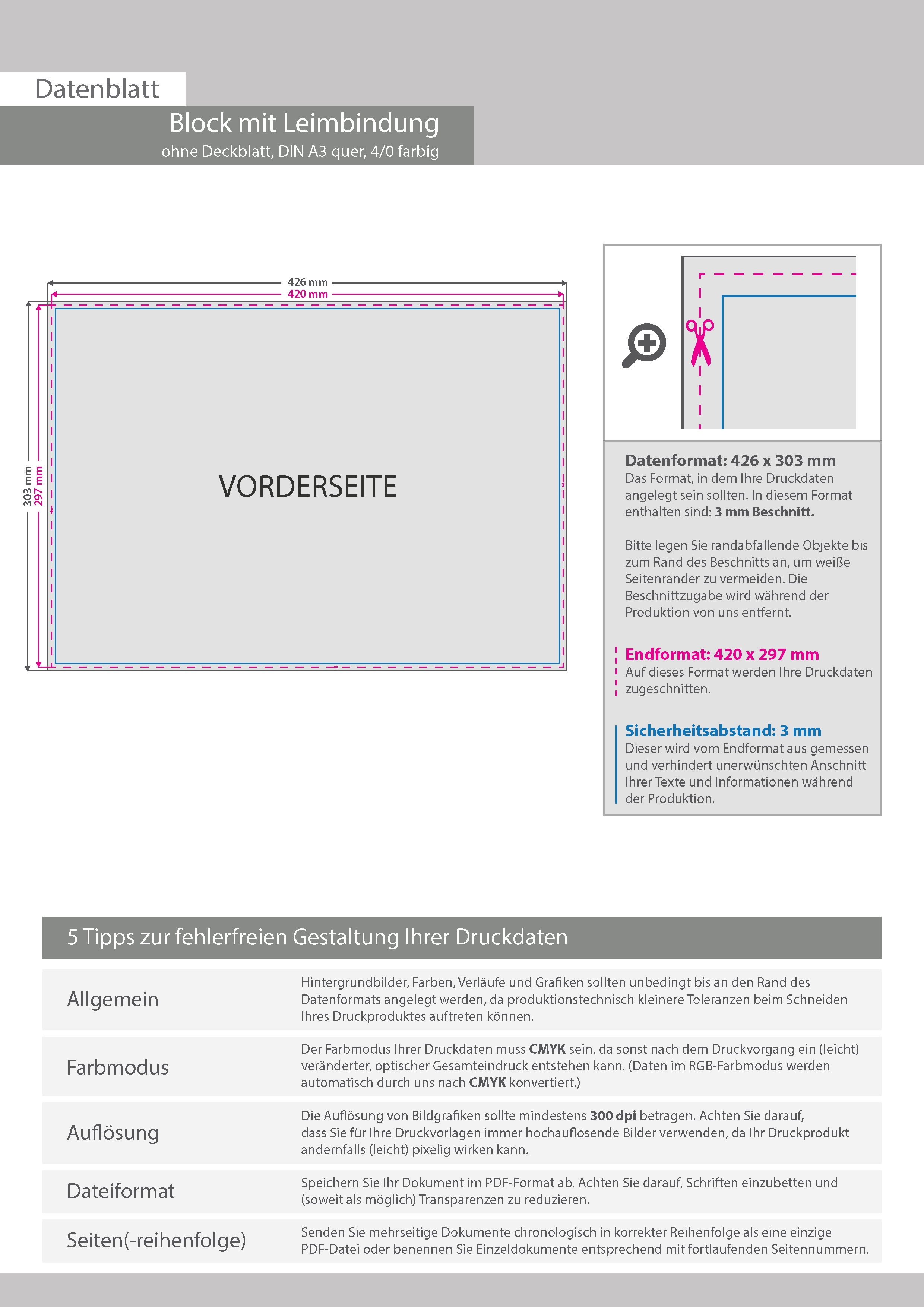 Block mit Leimbindung, DIN A3 quer, 200 Blatt, 4/0 farbig einseitig bedruckt