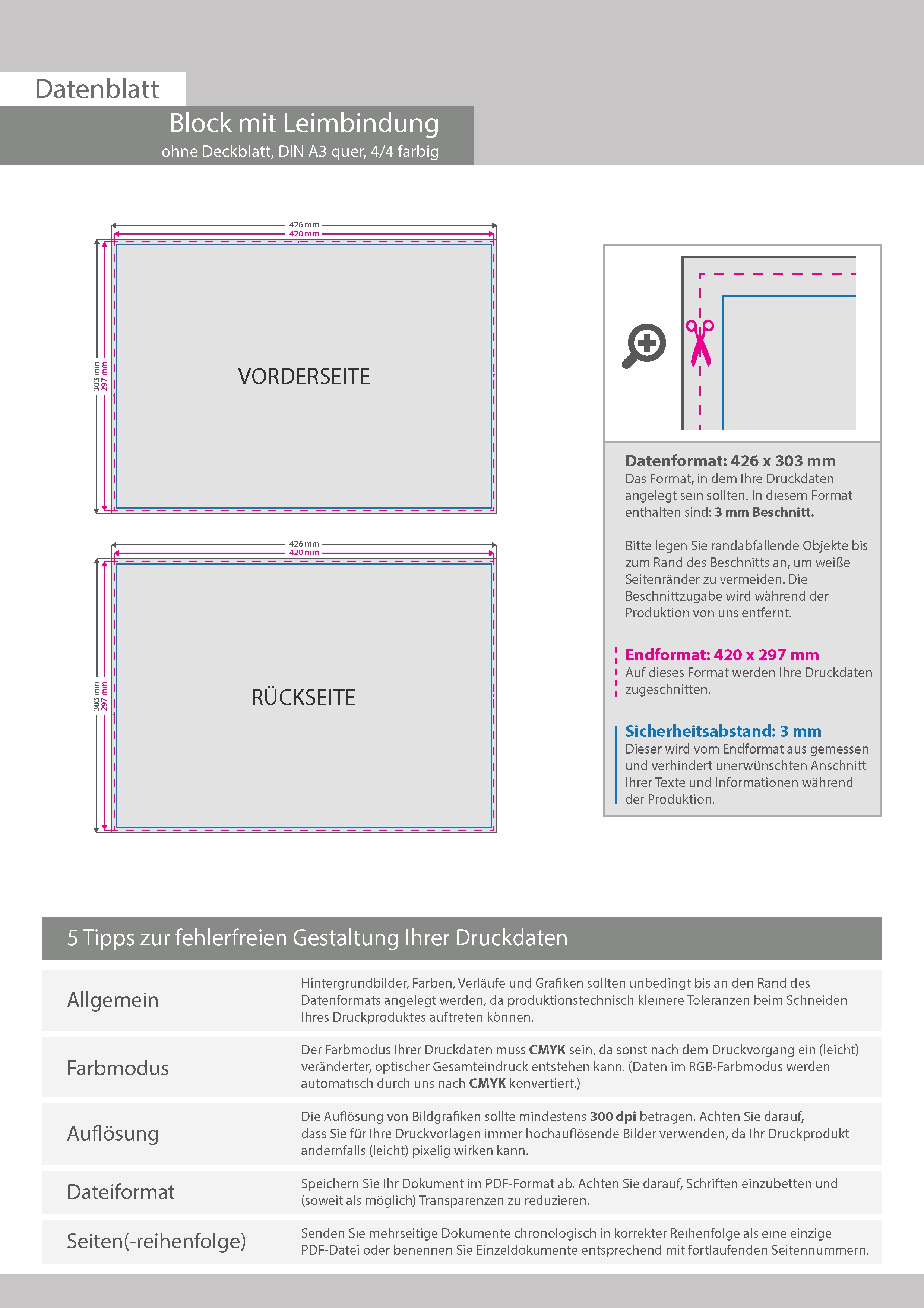 Block mit Leimbindung, DIN A3 quer, 50 Blatt, 4/4 farbig beidseitig bedruckt