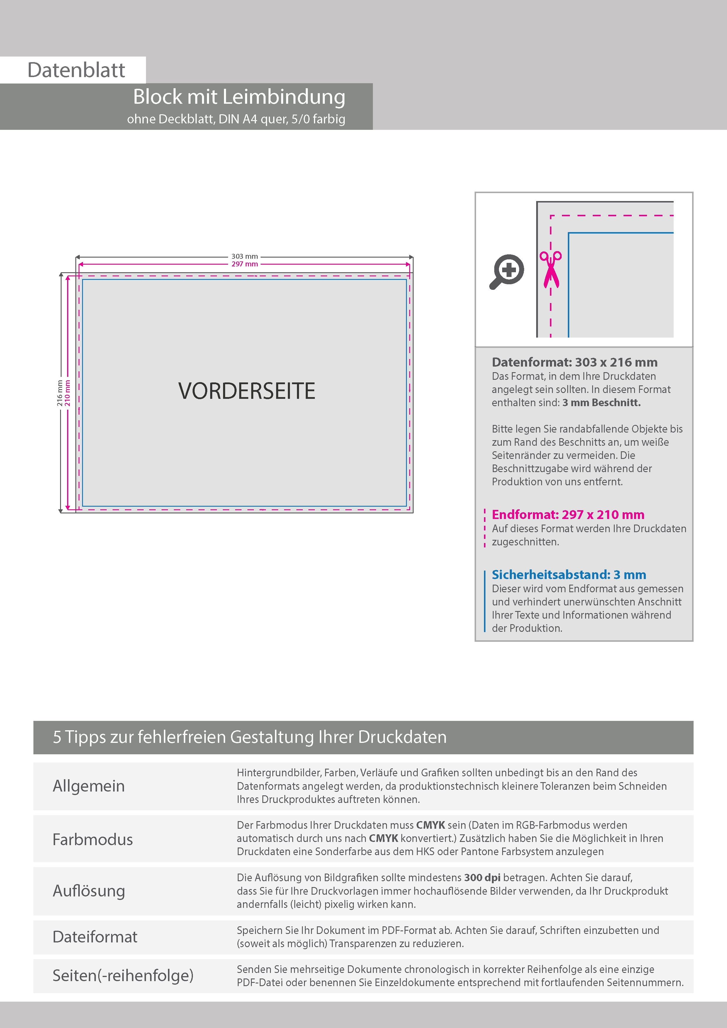 Block mit Leimbindung, DIN A4 quer, 10 Blatt, 5/0 farbig einseitig bedruckt (CMYK 4-farbig + 1 Sonderfarbe HKS oder Pantone)