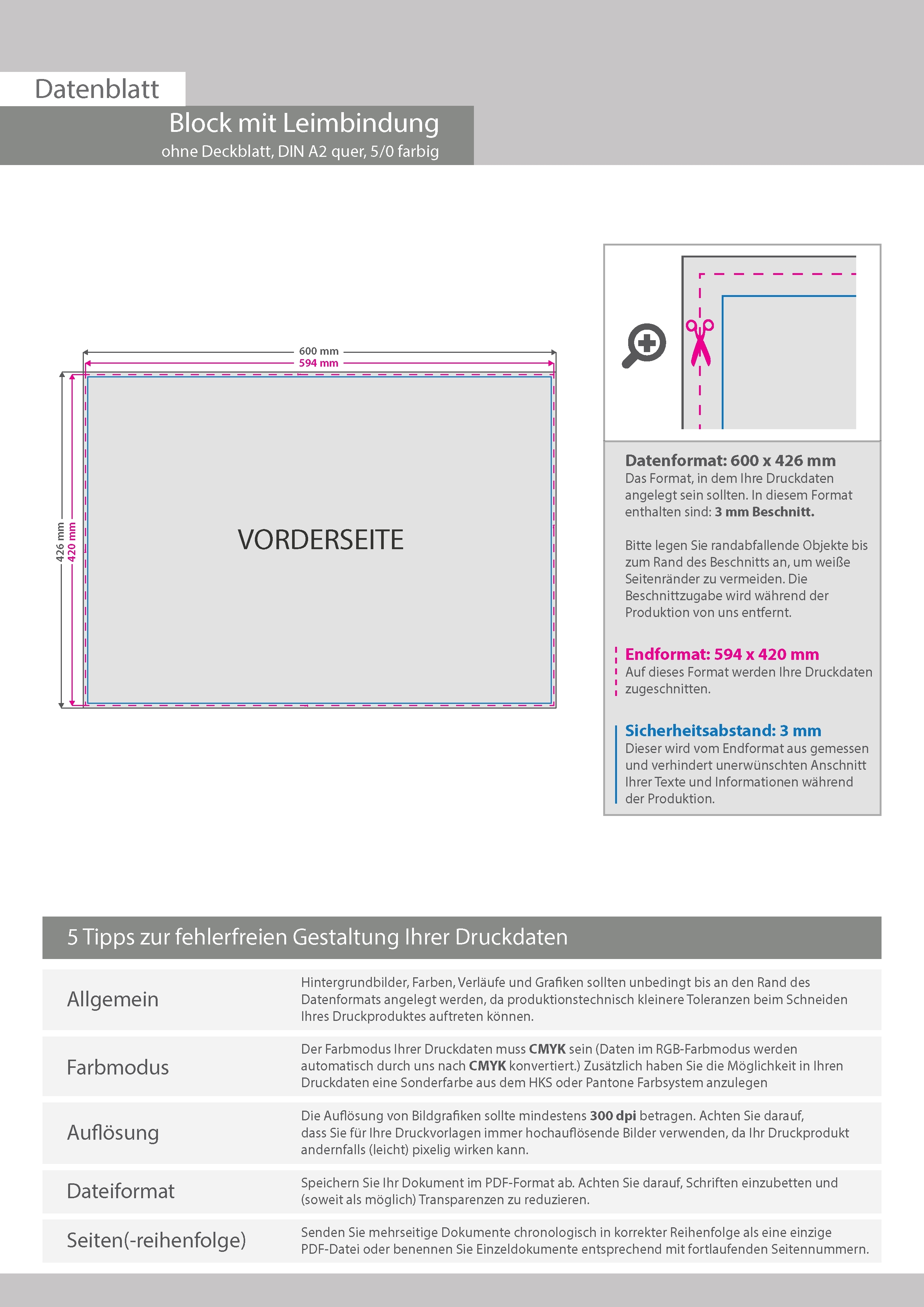 Block mit Leimbindung, DIN A2 quer, 50 Blatt, 5/0 farbig einseitig bedruckt (CMYK 4-farbig + 1 Sonderfarbe HKS oder Pantone)